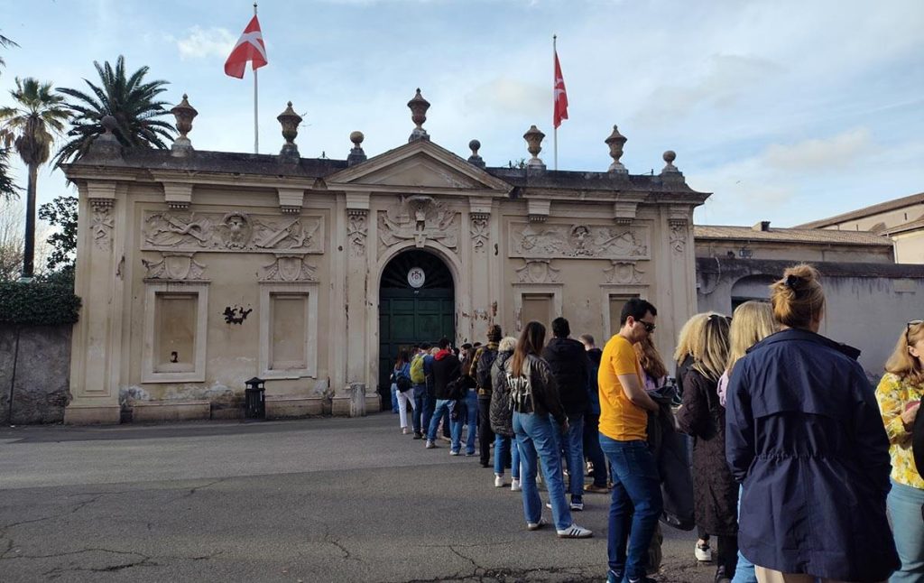 Ουρά για την κλειδαρότρυπα στον Αβεντινό Λόφο, από την οποία βλέπεις καδραρισμένο το θόλο του Αγίου Πέτρου.